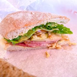 Honey Baked Ham topped with Swiss cheese, lettuce, tomato, pickles, crispy onions, Dukes Honey Mustard, and sweet honey glaze on ciabatta.